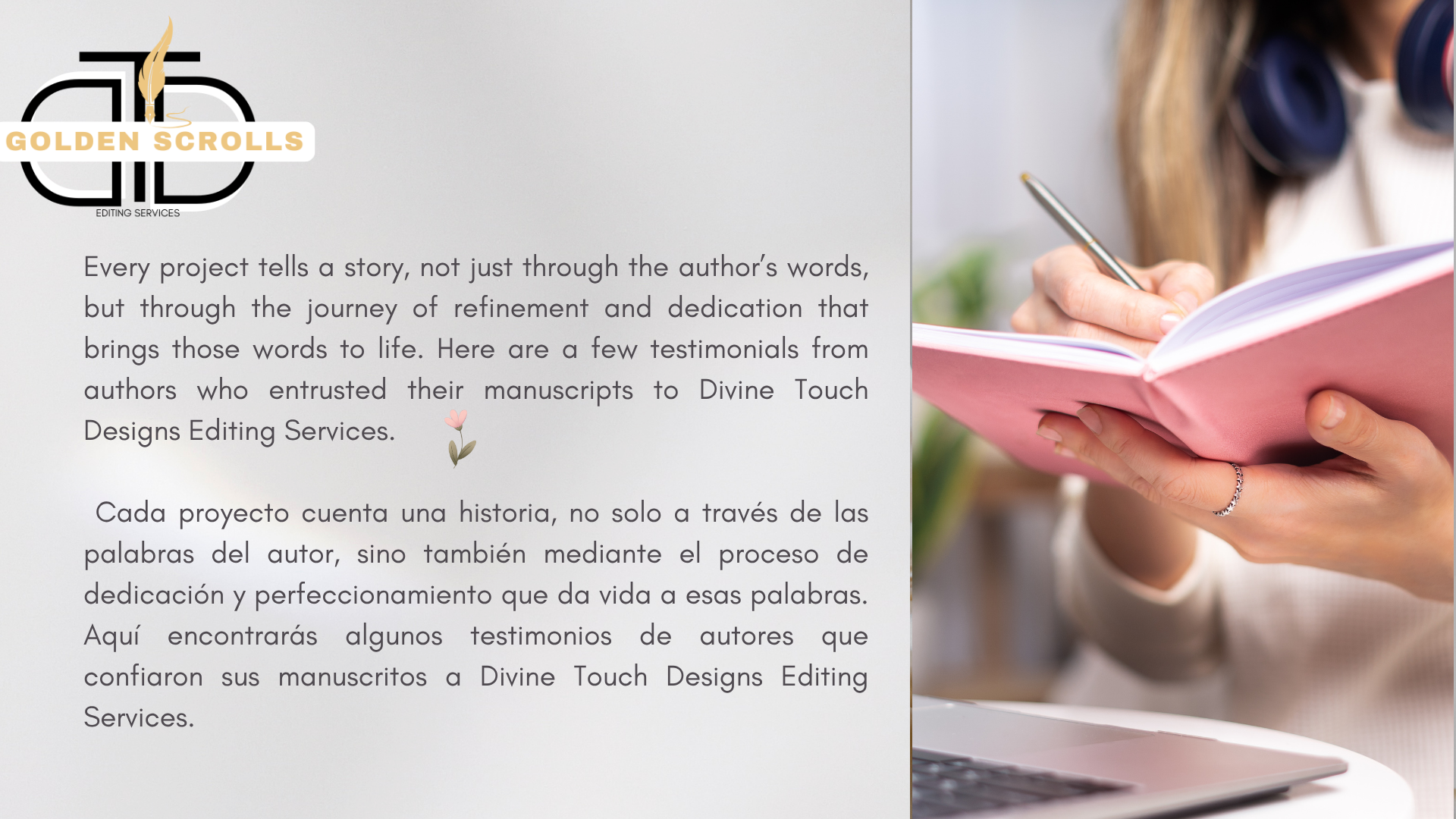 En Golden Scrolls por Divine Touch Designs, ayudamos a autores cristianos a dar vida a sus palabras inspiradas por Dios con excelencia, claridad y gracia. Cada proyecto está guiado por la oración y el propósito divino, transformando tu manuscrito en un rollo dorado que inspira y glorifica a Dios.